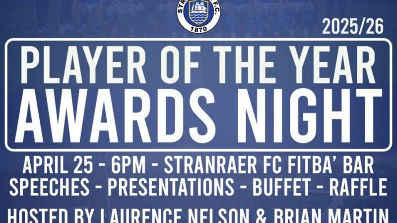 Join us for a celebration with players, staff, volunteers and supporters as we bring the curtain down on our 2025/26 season. Date: Saturday 25 April 2026 Doors open: 6pm Location: Stranraer FC Fitba Bar Hosted by the Blues commentary duo of Laurence Nelson and Brian Martin, the night kicks off with a warm welcome from … Continue reading Stranraer FC End of Season Awards Night 2025/26